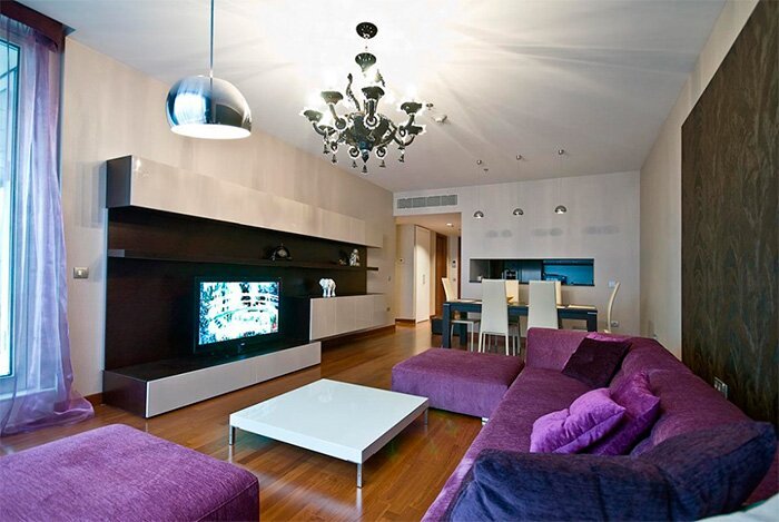 Изысканность и сдержанность – вот те броские нюансы, которые рождают решение хозяев квартиры оформить наиболее эффектную комнату для гостей в фиолетовый интерьер. Такое помещение будет обладать несомненной элегантностью и даже некоторой таинственностью.